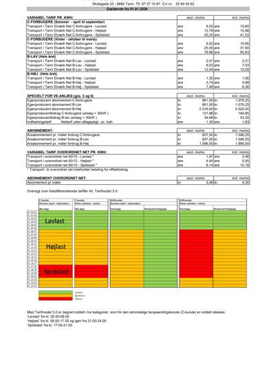 I den farvede tabel kan du se hvilke perioder der er billigst, og dermed planlægge dit forbrug ud fra hvilken kundetype du er: